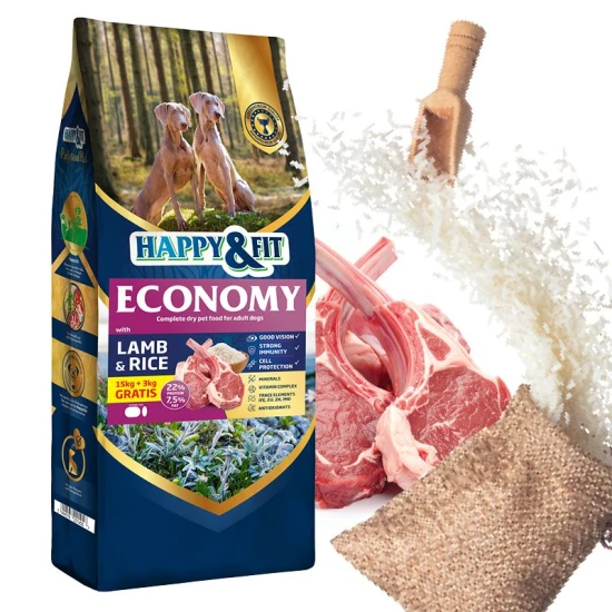 A Happy&Fit Economy Adult Báránnyal és Rizzsel egy teljesértékű száraztáp felnőtt kutyák számára, amely ideális választás mindennapi etetésre.